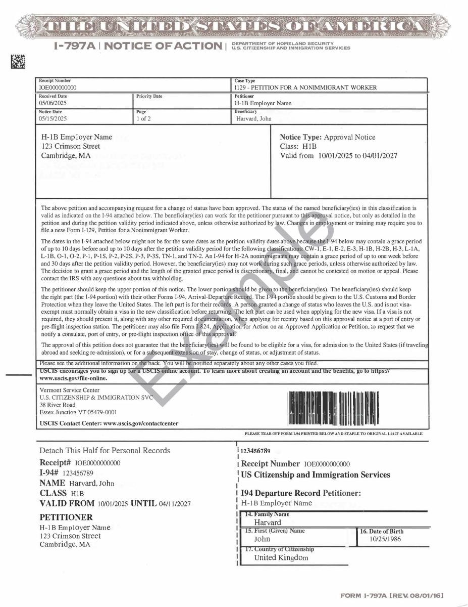 Example of an I-797 H-1B Approval Notice showing a change of status.